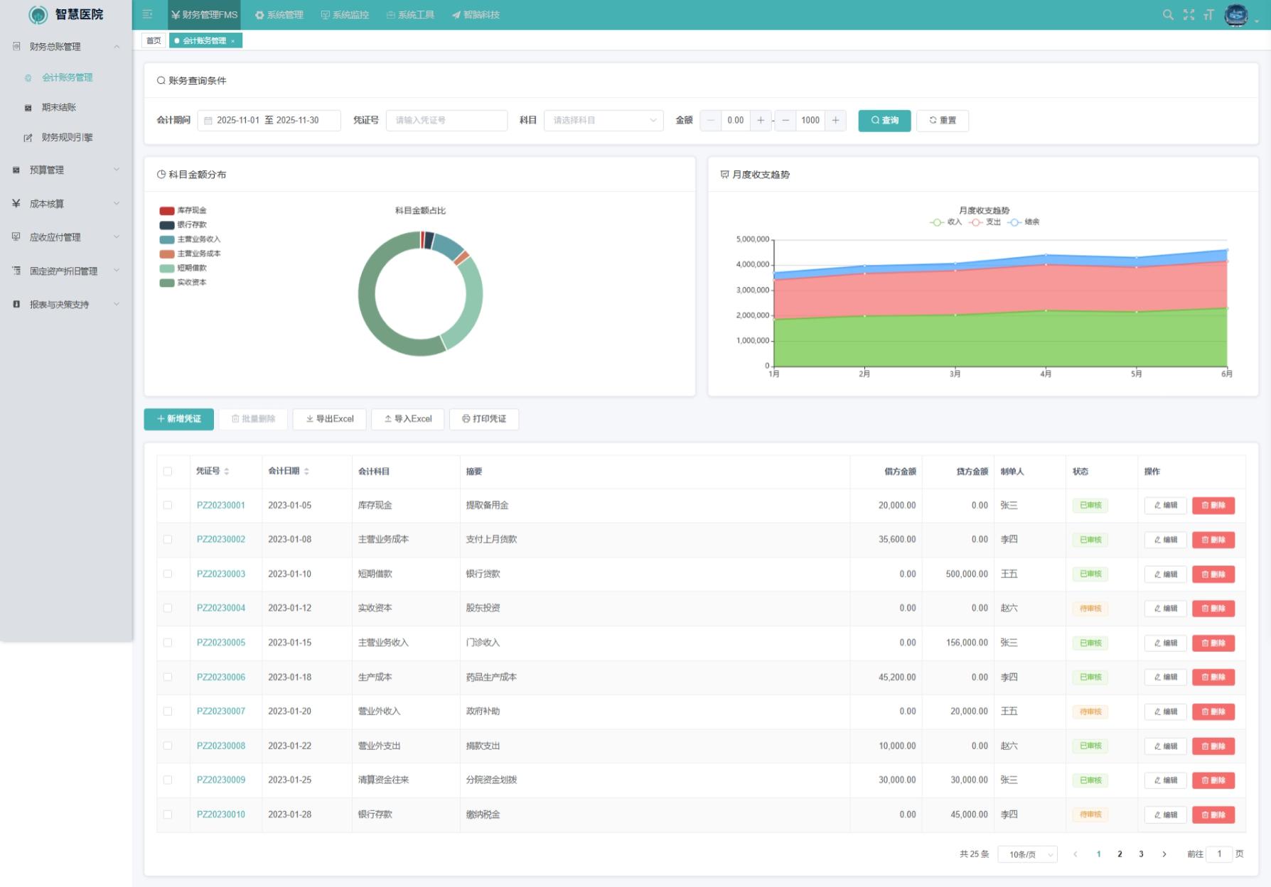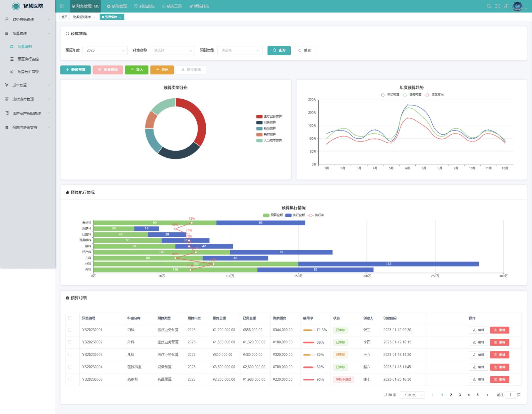 预算编制功能是医院财务规划的重要支撑,允许用户按年度、季度或科室维度设定收支预算,并依据历史数据生成智能预算预配置。