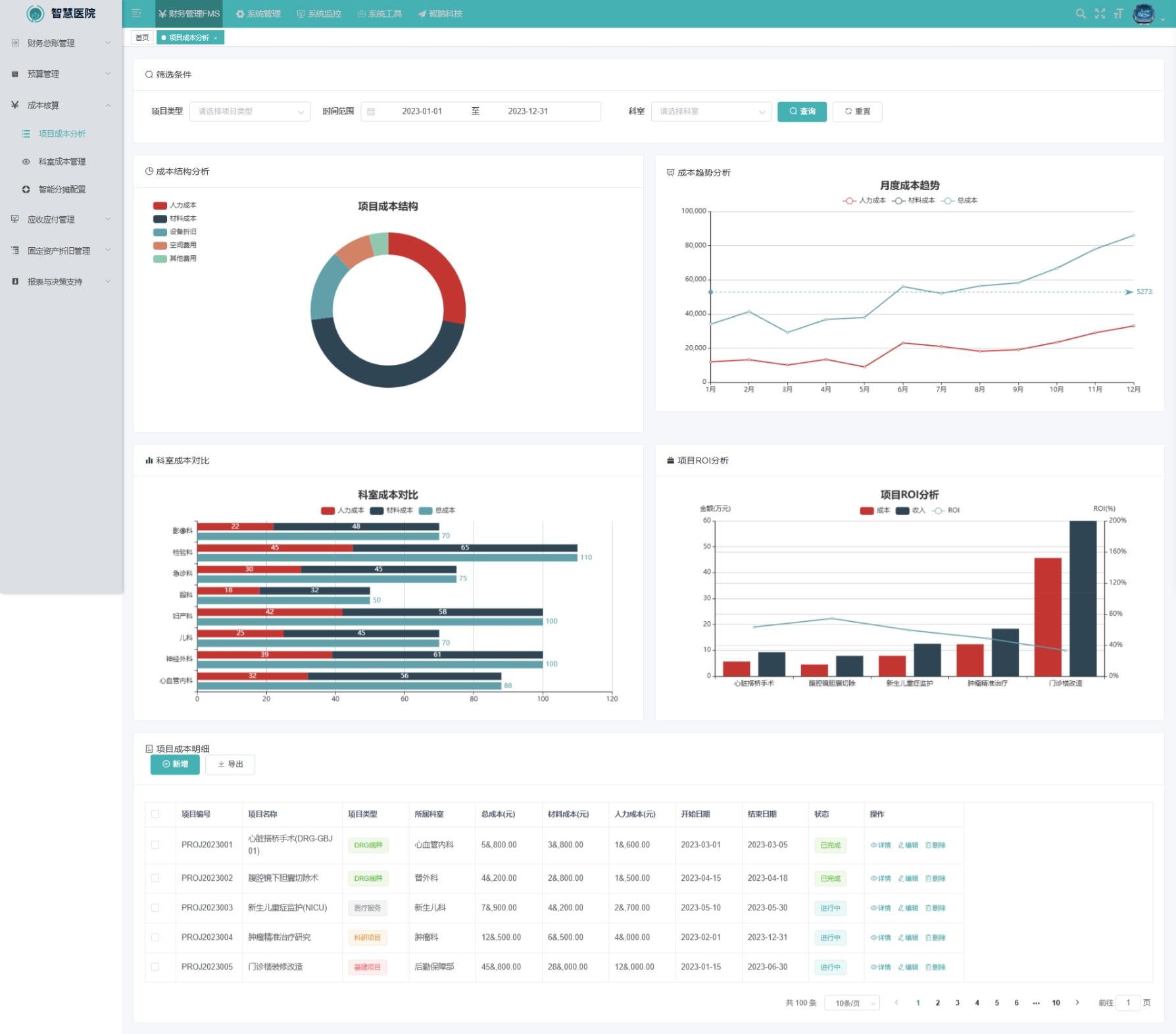 项目成本分析功能可用于医院不同医疗服务项目或治疗方案的成本统计与分析,帮助医院识别效率、优化资源配置。