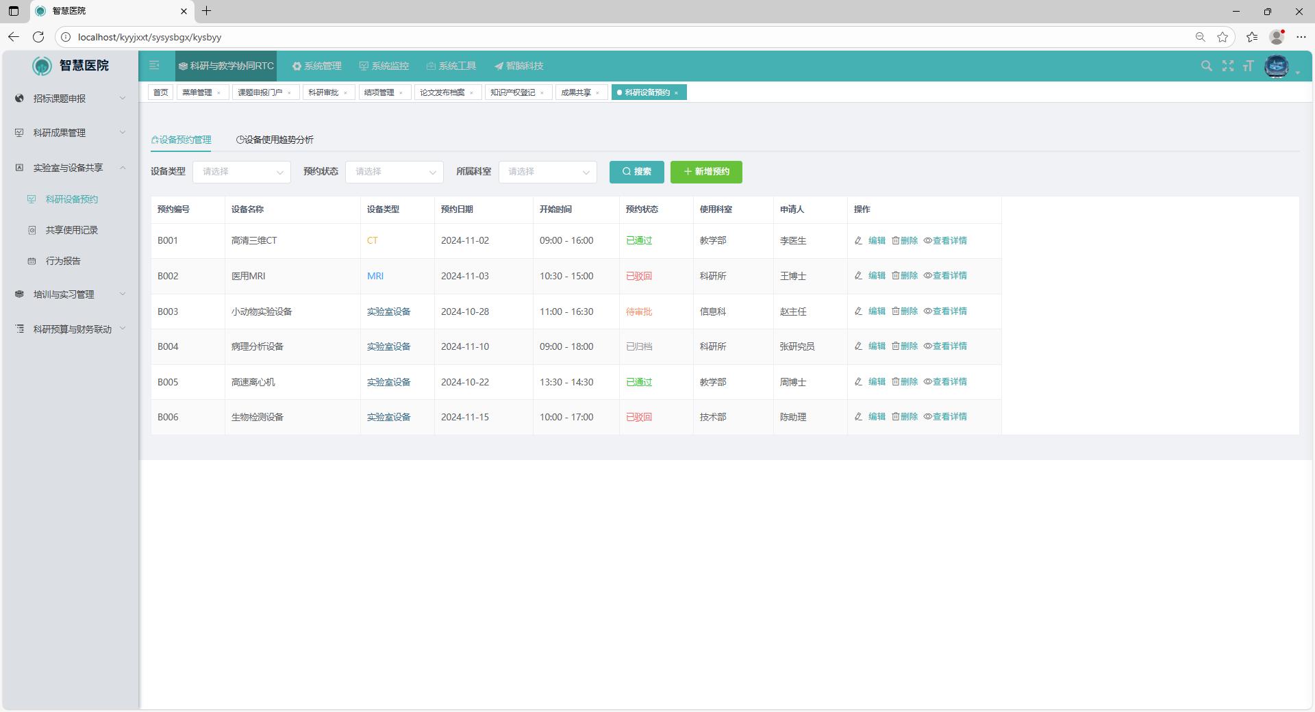 科研设备预约模块是科研资源管理的重要组成部分,支持科研人员对实验室、大型仪器及生物样本保存库进行预约管理。用户可通过界面选择需要使用的设备名称、预约时间、实验目的、使用人数等信息,并提交预约申请。