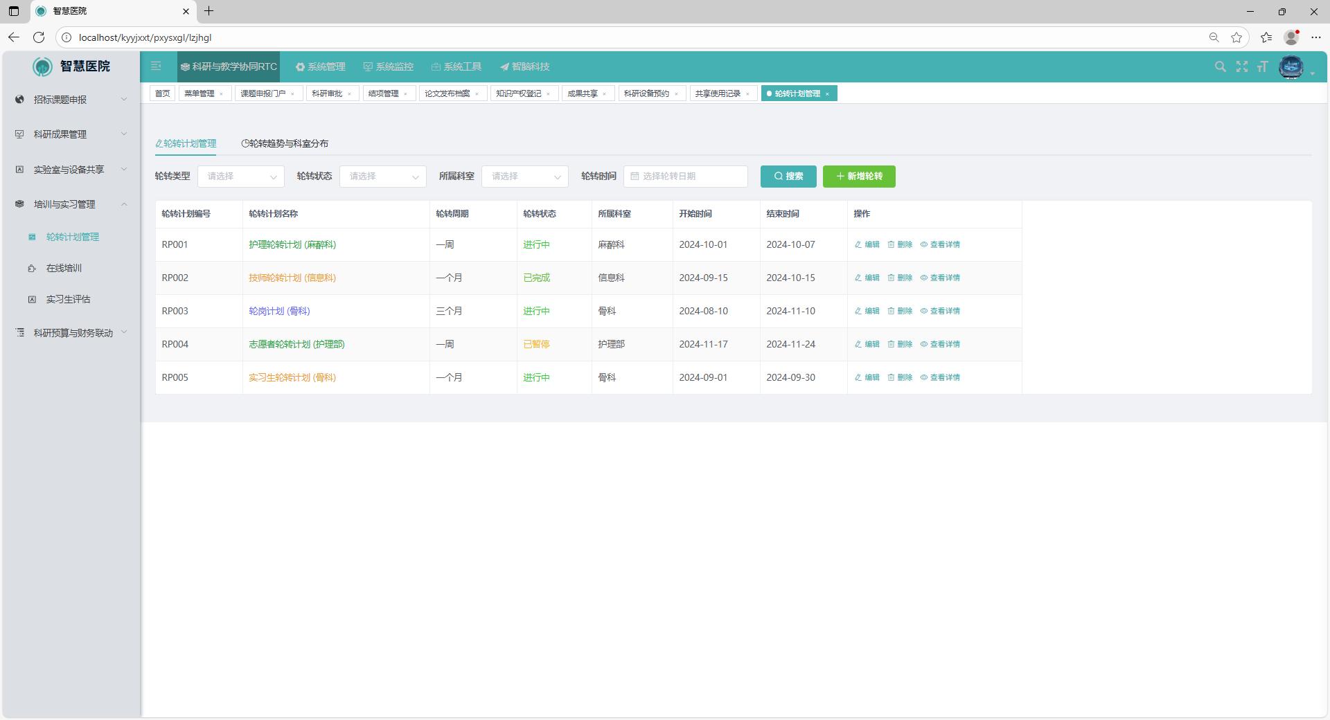 轮转计划管理模块用于金融、服务、技术等岗位的人才交流与轮岗安排,是提升医院科研与教学人员综合能力的重要工具。用户可通过该模块制定实习计划,包括轮转周期、轮转岗位、实习人员信息、岗位职责等,并在系统中进行执行状态的跟踪与管理。