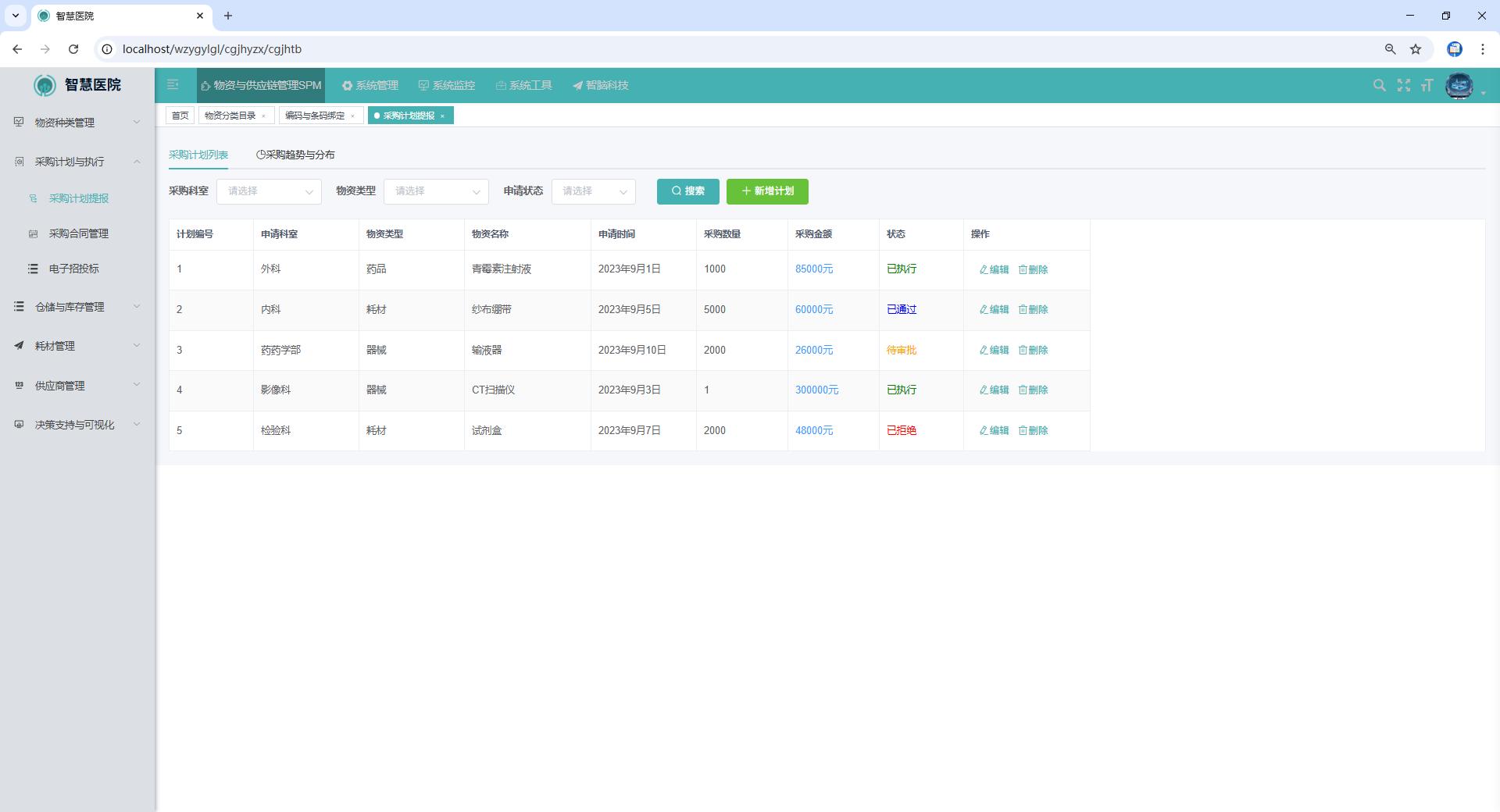 科室可通过系统提交物资采购需求,系统支持多种提报方式,包括手动填写、电子表格导入等。AI会根据历史消耗数据、科室使用频率、库存情况等参数,智能生成采购建议,帮助科室合理规划采购计划,避免库存积压或短缺。系统还支持采购计划的审批流程,确保采购决策的合规性。