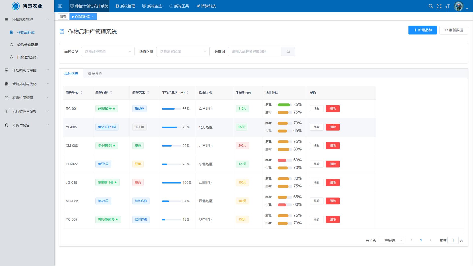 维护作物基础数据(生长期、需肥量、温湿度要求等),支持分类检索与批量导入/导出。