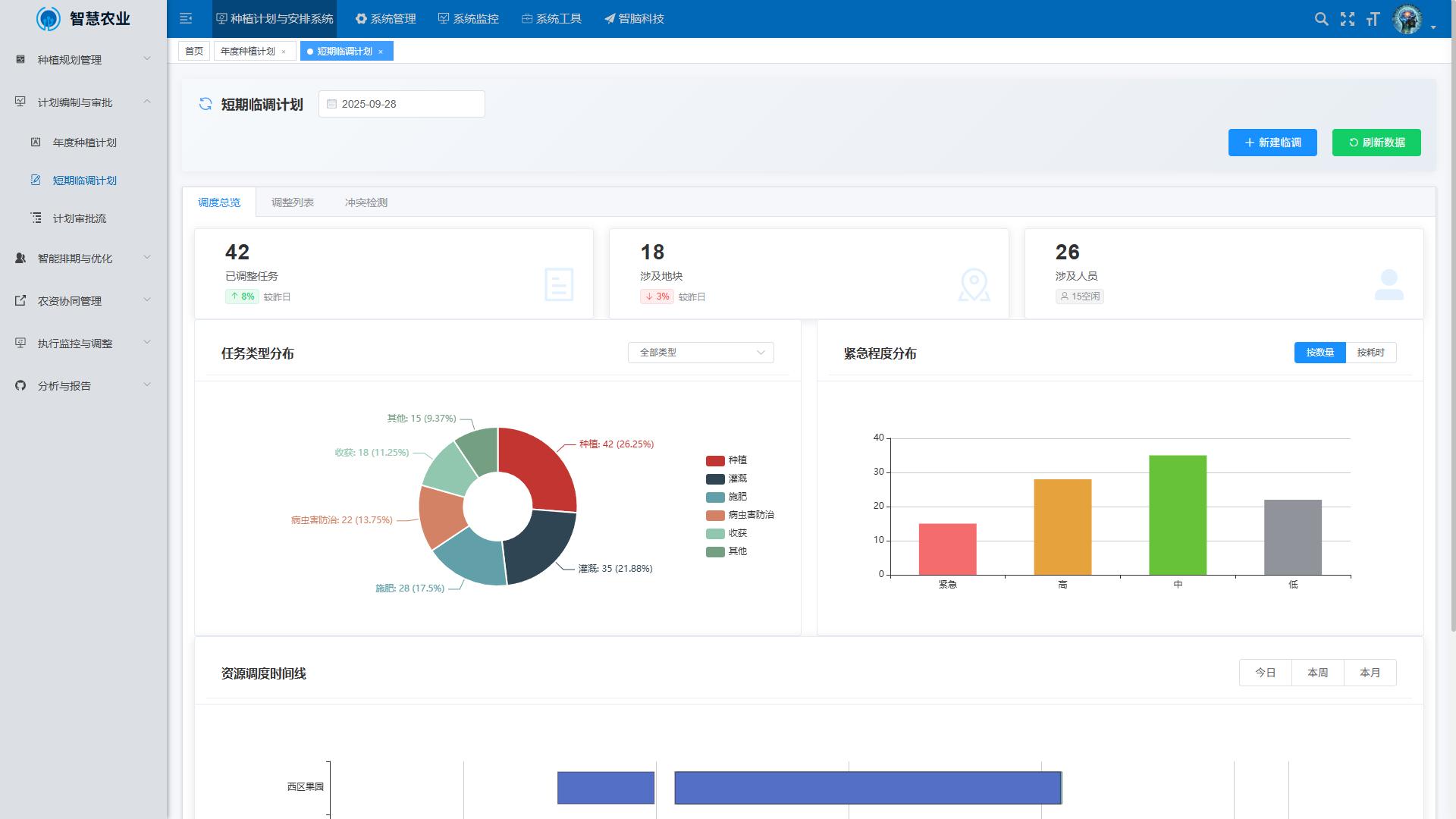 系统自动检测时间段内的资源(农机、人员)冲突,提供冲突解决方案(如调整时间或外包)