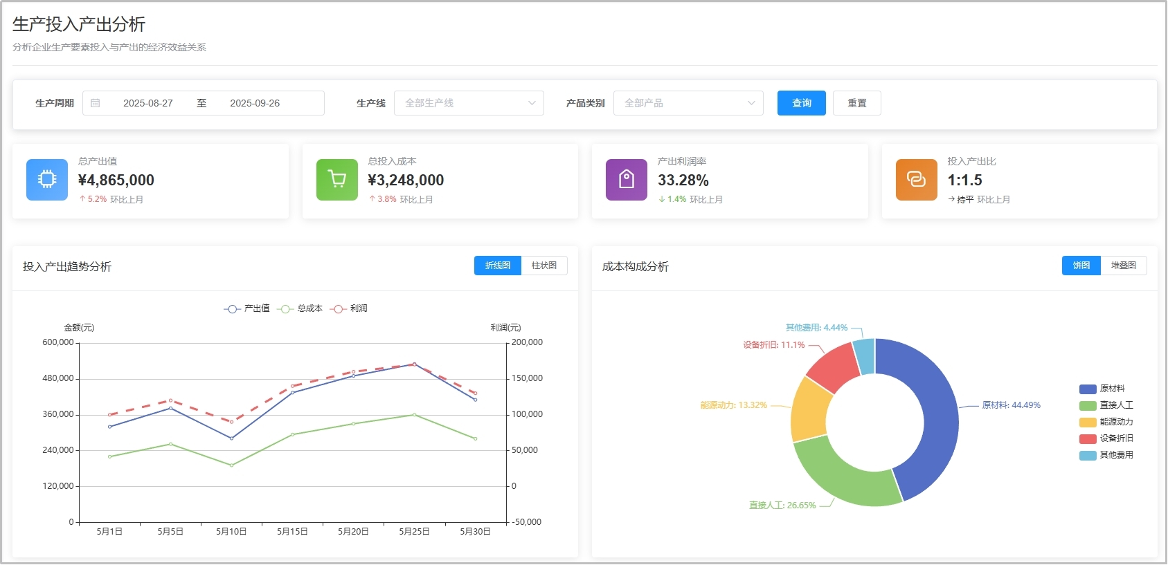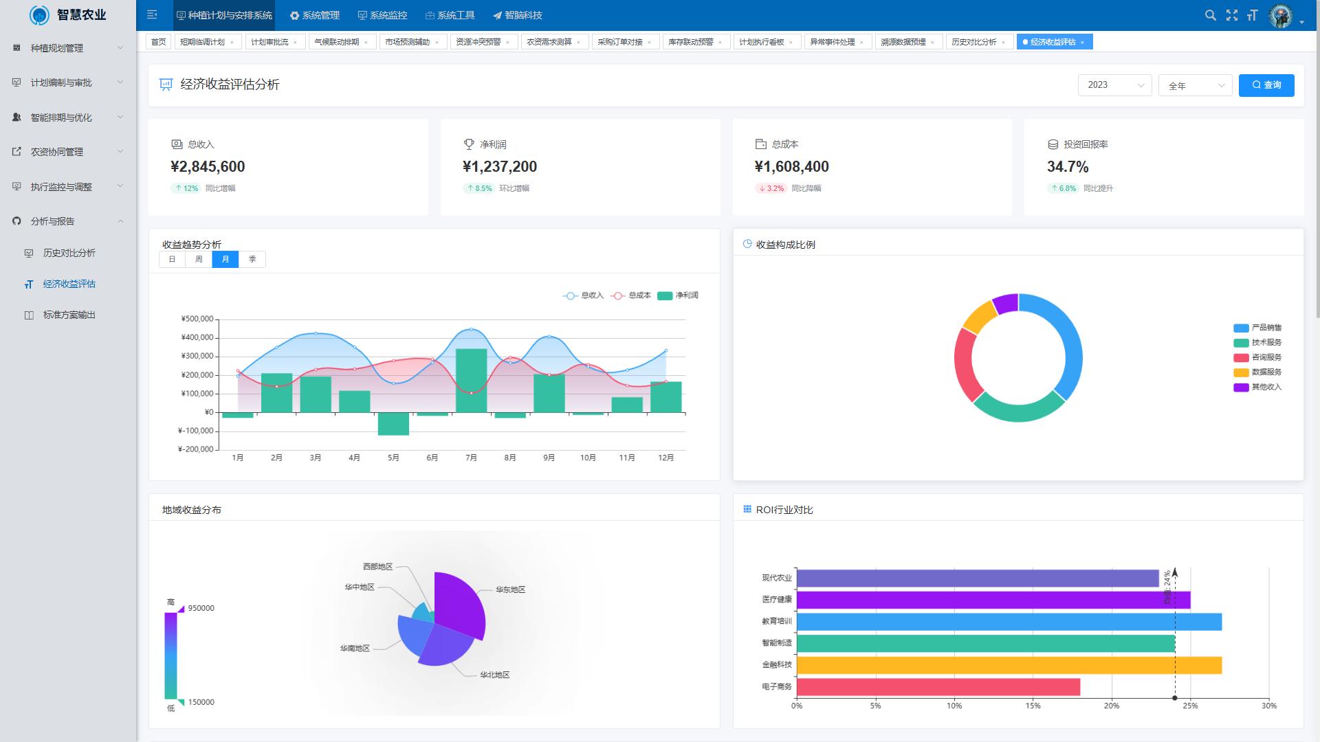 根据农事活动和台账数据,生成投入产出比、成本收益等关键指标的可视化报告。