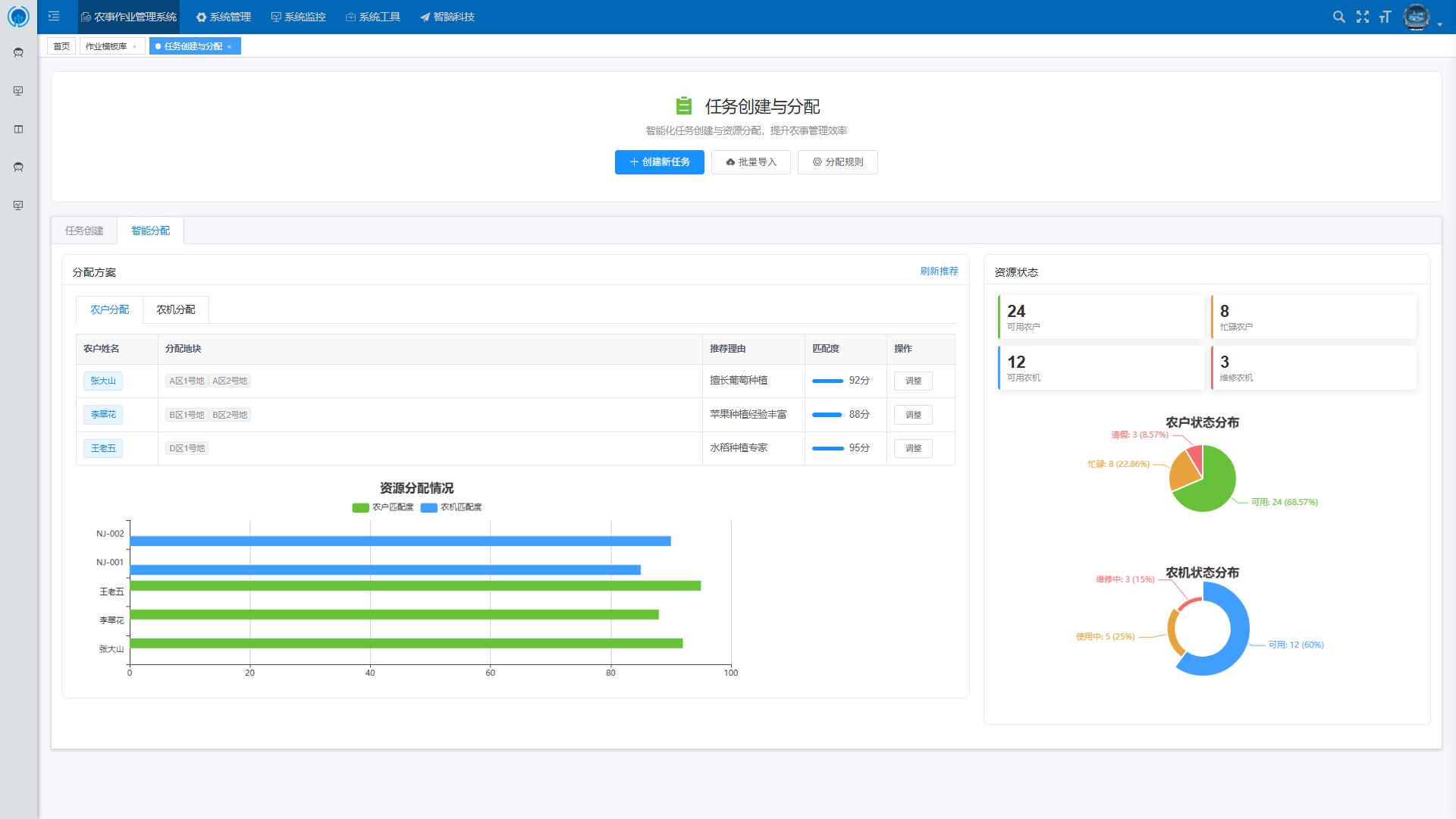 通过分析农户历史作业记录、技能水平等,系统会自动推荐高契合度的农户/农机,同时提示其技能缺口,便于安排培训或调整任务。