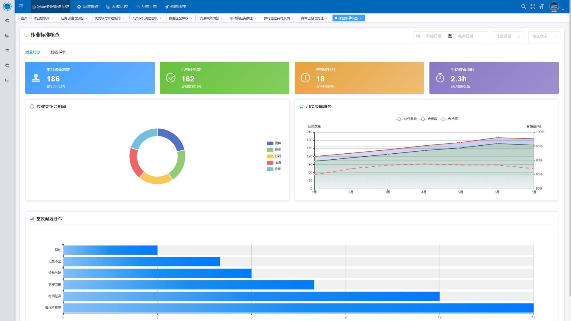 系统自动生成详尽的效率分析报表,包括任务人均作业量、平均耗时、低效环节识别等,为优化作业流程提供数据支持。