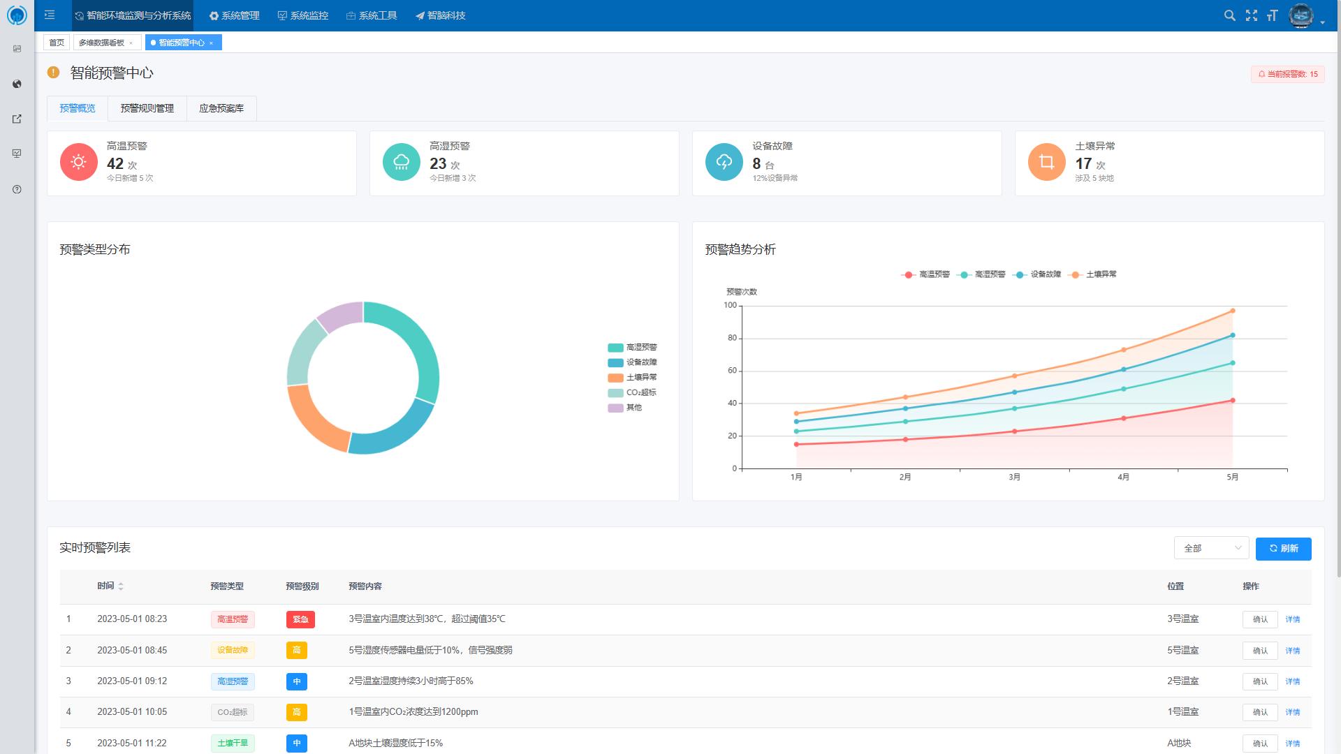 系统提供一个集中展示界面,包含空气温湿度、光照强度、土壤墒情、CO₂浓度、空气质量等关键参数。