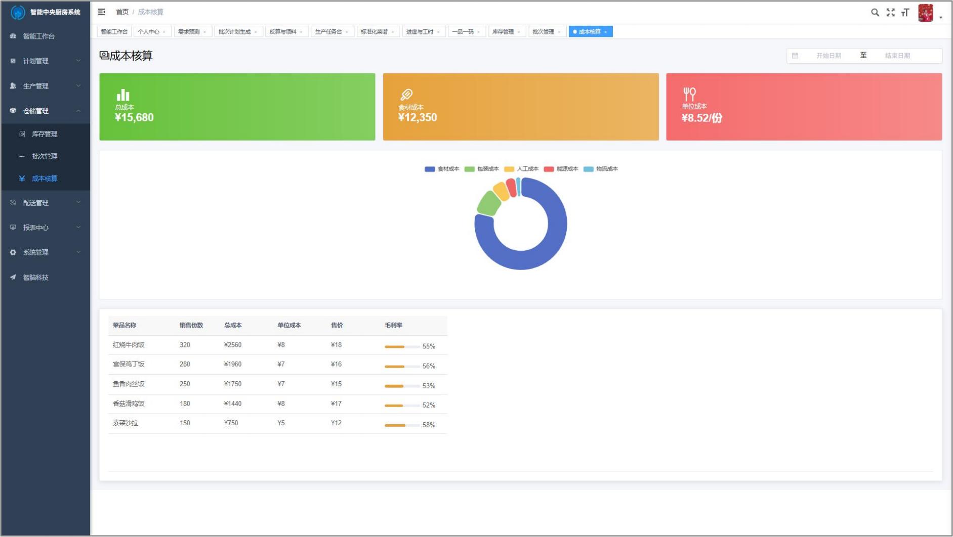 核算方式: 1.根据每个计划周期内的原料消耗量和价格计算总成本 2.分摊到每道菜品的成本明细 参考价值: 1.用于定价策略制定 2.支持成本对比分析
