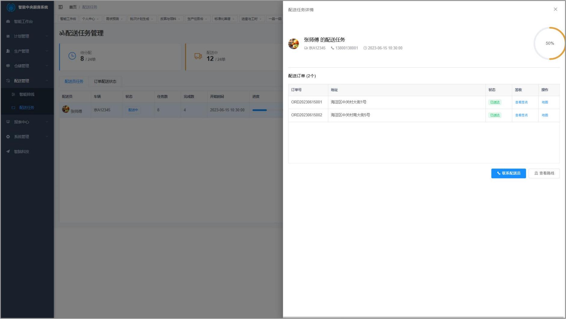 系统实现从订单管理、生产计划、原料领用、生产执行到配送与质量追溯的全流程数字化,确保各环节信息透明、操作规范,提升整体运营效率与协同能力。