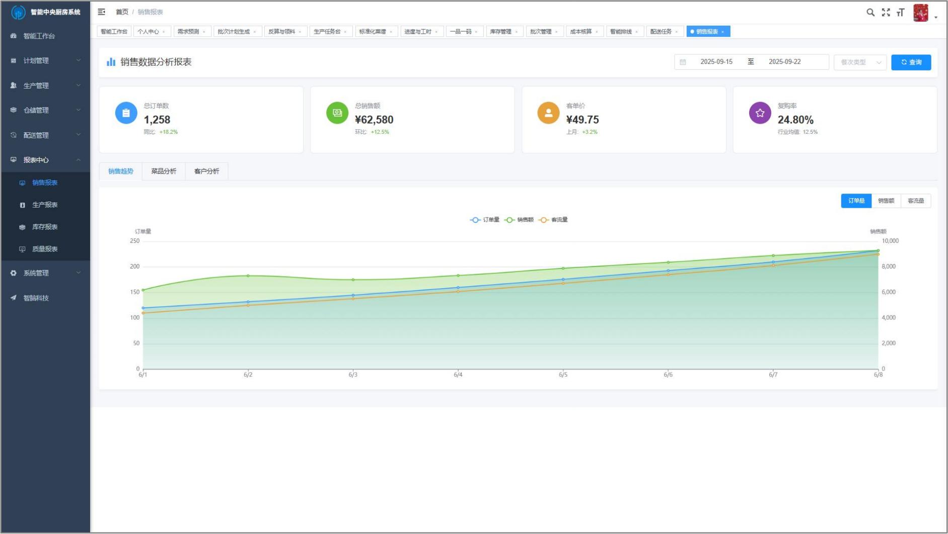 提供销售、生产、库存、质量等全面报表分析,支持图表交互与导出,为厨房管理提供数据驱动的决策依据,助力优化服务与运营策略。