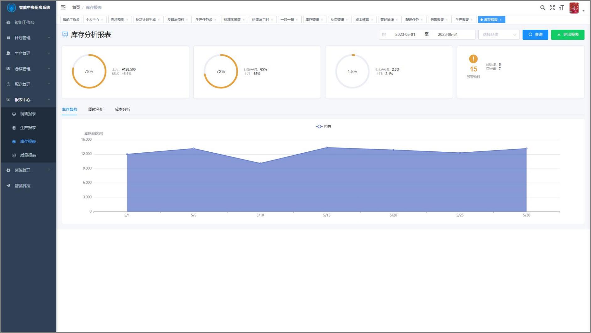关键指标: 1.原材料周转率 2.损耗率统计 3.成本变动分析 输出形式: 1.每日/每月报表导出 2.原料异常库存预警提示