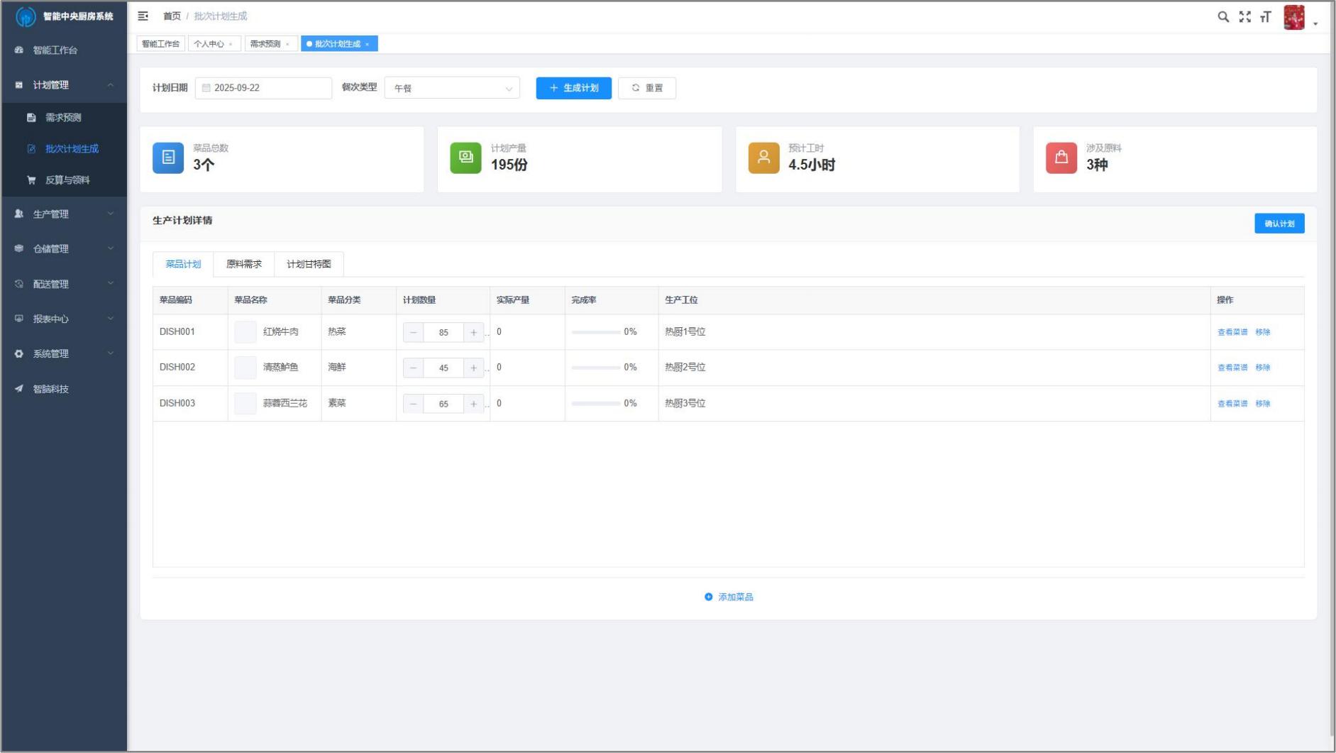 操作流程: 1. 选择计划周期(如:明日午餐) 2. 查看系统汇总的菜品生产需求 3. 可手动调整某些菜品的生产份数 4. 确认保存生成《总生产计划表》 下发机制: 生成后可一键转发至生产模块,确保生产任务准时执行。 提示功能: 异常订单会自动报警,提醒计划员优先处理。
