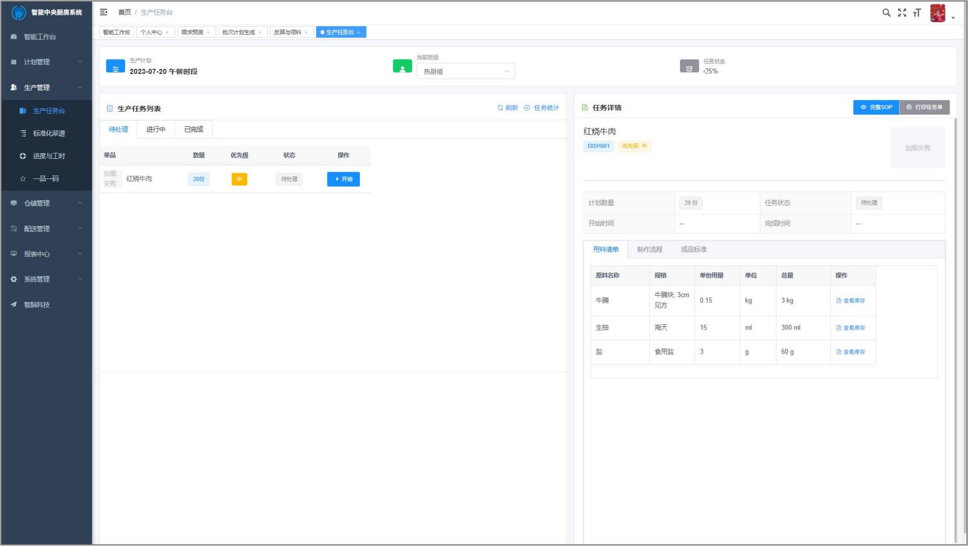 视图切换:根据用户身份自动显示相关任务,如: 热厨组:显示待制作的菜品、计划份数、菜谱、备注 包装组:显示分餐订单,含菜品、份数、配送地址、系统推荐的流水线策略 操作指引: 1.厨师点击“开始制作 ”,记录开工时间 2.每道菜品制作完成后点击“完成出品 ”,系统更新总体进度 3.系统支持每道菜的图片上传,便于质检和追溯