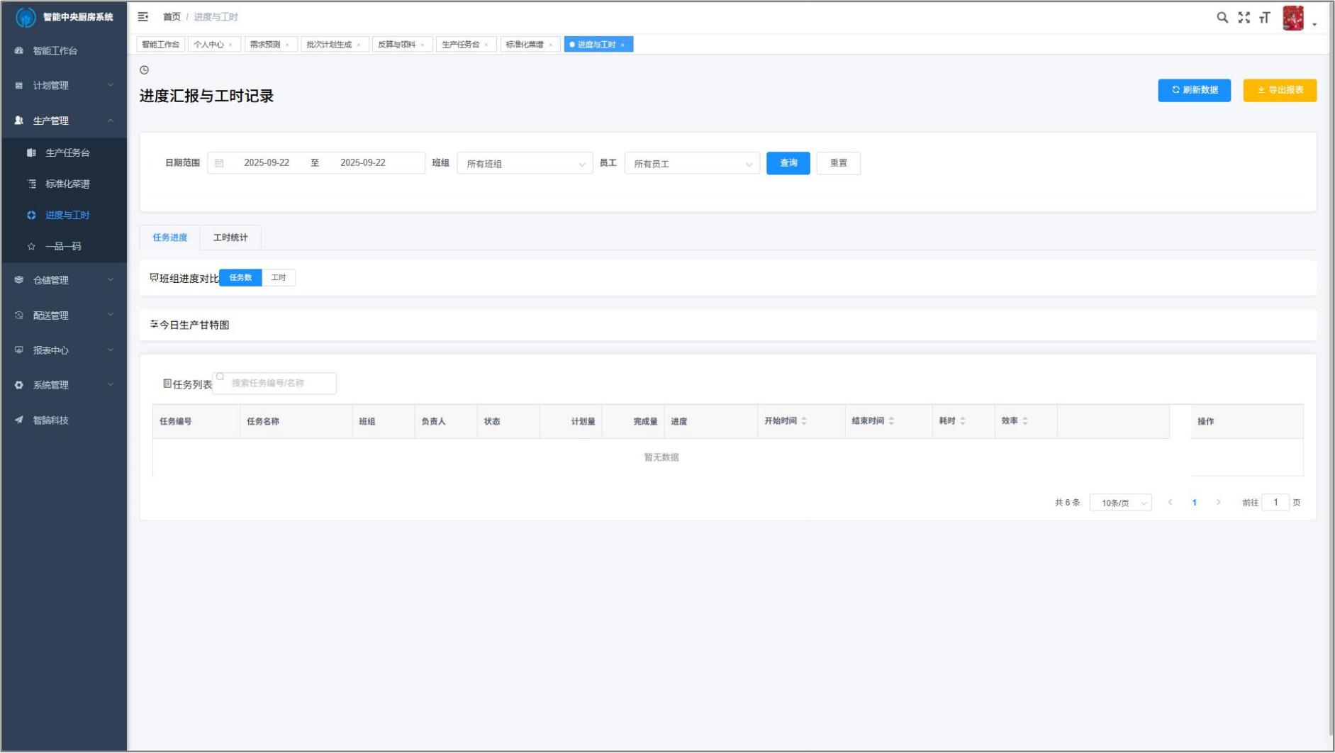 今日订单总数:显示当前未完成订单的总数,支持实时刷新。 预计总产值:根据订单金额和菜品价格计算当前计划的总收入。 订单完成率:已完成订单数量与订单总数比例显示,用于衡量当日生产情况。 异常订单数:统计带有退款、特殊要求或投诉的订单数量,可点击筛选查看具体订单。 预警信息:系统会根据库存状态和生产安排,实时显示库存不足、供货延迟、产能饱和等预警信息。