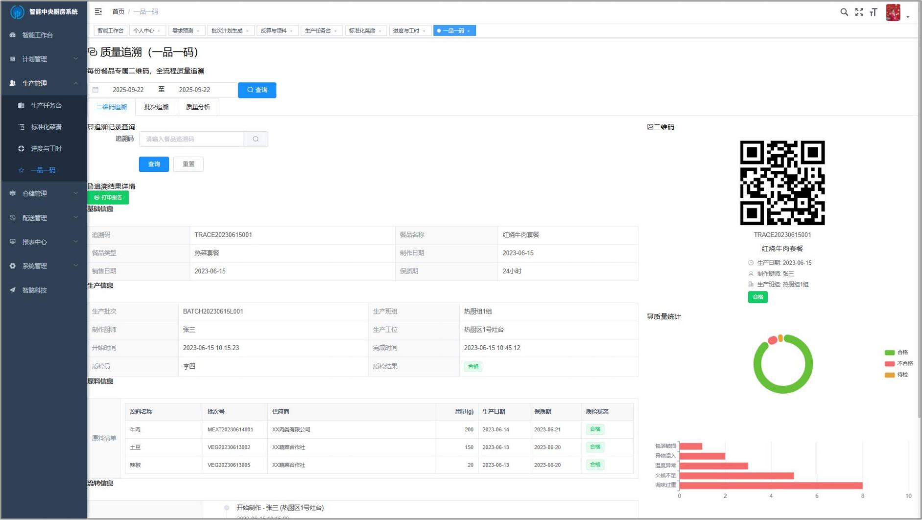 实施机制: 1. 每份餐品在出库时自动绑定二维码 2. 扫码可查看责任人、制作时间、原料批次、出锅时间等 重要意义: 1.快速定位异常订单 2.明确生产责任归属 3.便于与其他系统(如 HACCP、ERP)集成