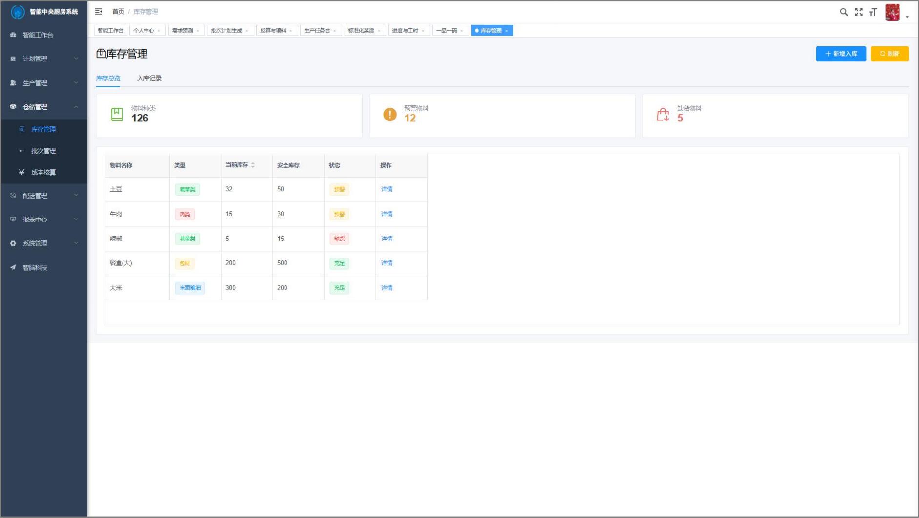 看板功能: o 实时显示所有原材料、包材库存,可切换展示表格或可视化看板o 支持库存类型筛选(如:易腐品、包装材料等) . 入库流程: 1. 扫描食材条码或手动录入 2. 填写批次、生产日期、供应商信息 3. 系统自动记录入库时间与数量 . 出库管理: 1. 系统根据领料单推荐出库原料 2. 支持FIFO 出库策略 3. 扫码确认出库操作 4. 自动减少库存并记录出库日志