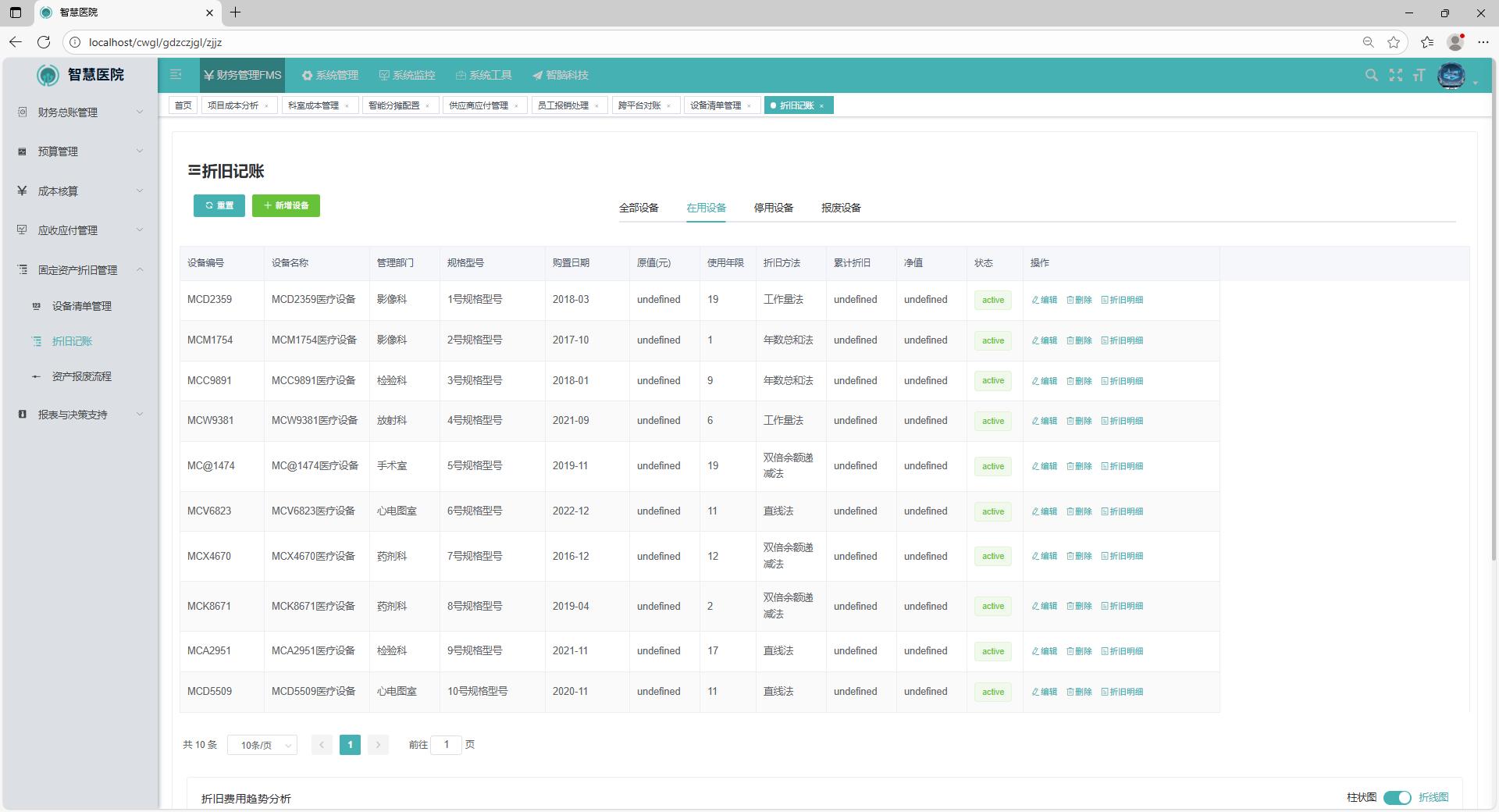 系统自动计算资产的折旧情况,显示设备的折旧率、剩余使用年限、报销进度等信息,辅助医院进行资产全生命周期管理。