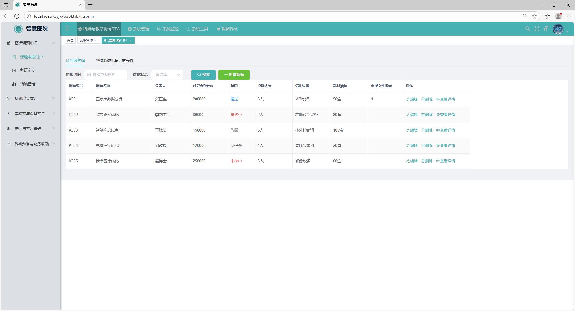 课题申报门户是科研人员和项目团队在开展科研项目前进行信息提交的主入口。用户可通过该模块填写完整的课题申报材料,包括课题名称、研究方向、研究内容、研究方法、技术路线、研究周期、预算构成、人员安排、设备与耗材需求等内容。