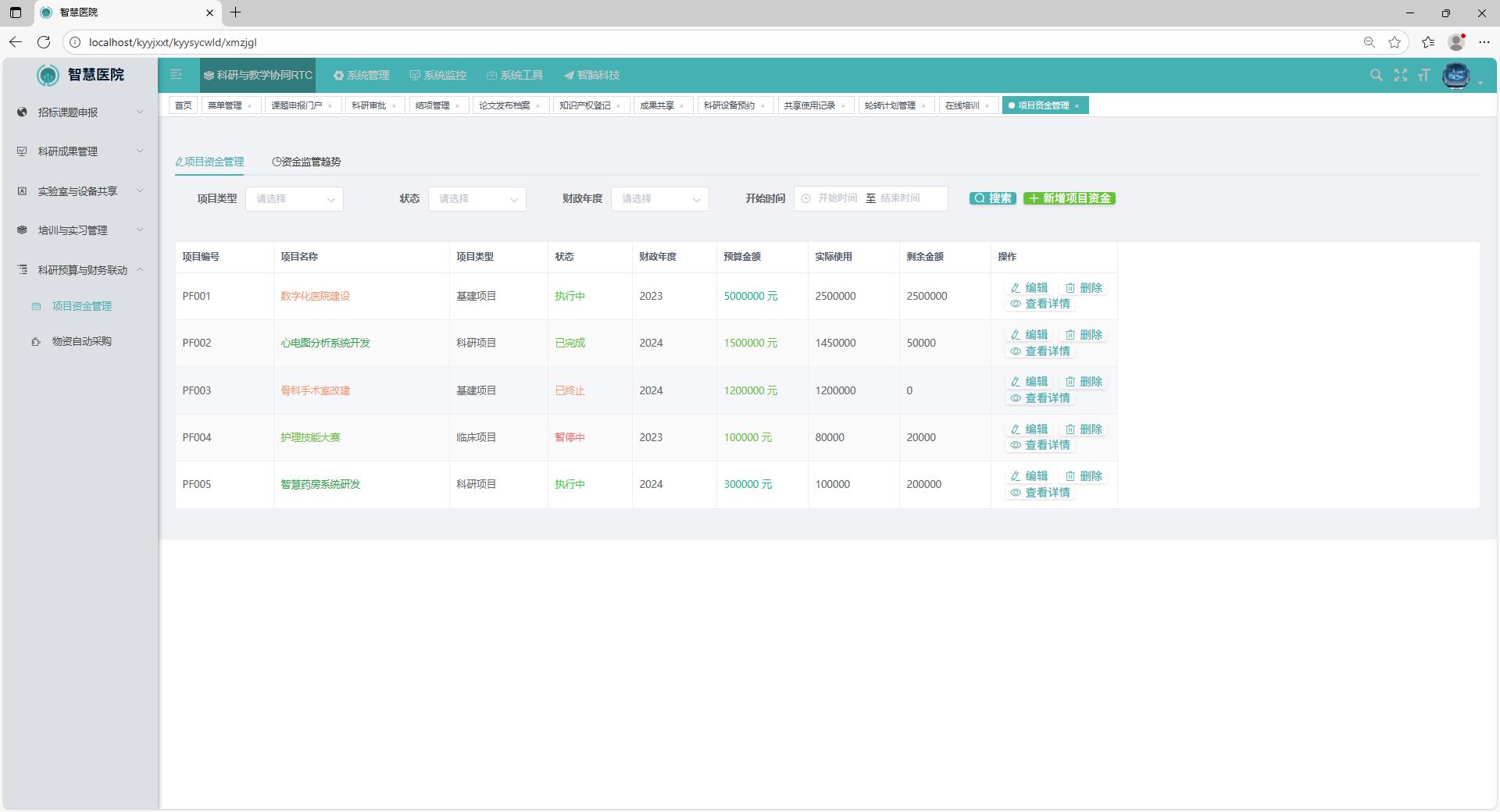 项目资金管理模块为科研项目提供完整、透明的资金使用流程管理,涵盖了预算制定、资金审批、拨付、支出记录、对账、超支预警等多个子功能。用户可在该模块中录入项目预算,系统支持预算分类管理和自动分配机制。