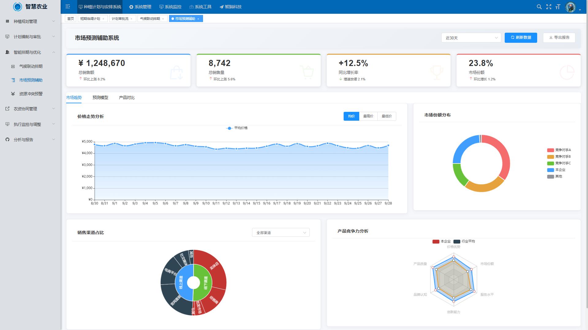 集成气象、市场、设备、农户行为等多源数据,支持智能分析、趋势预测、产量销售看板,帮助农场主实现数据驱动的精细化运营。