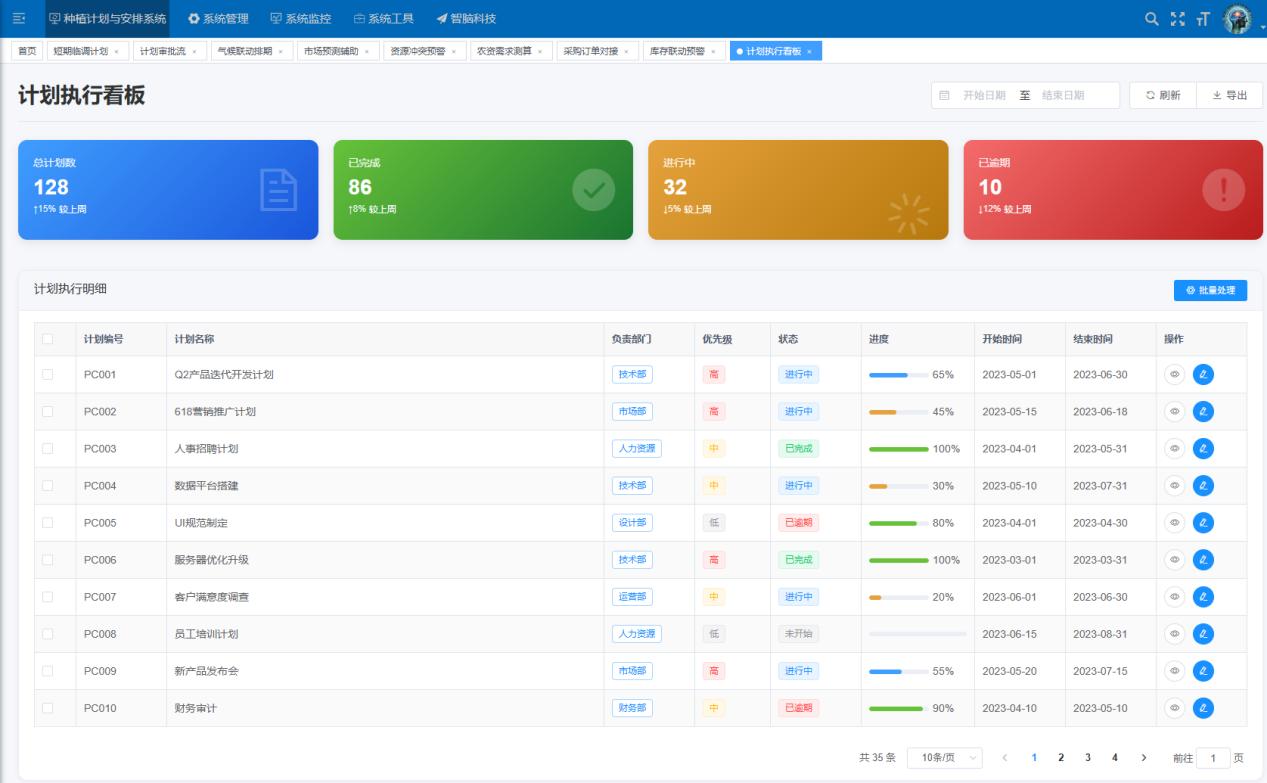 可视化对比计划进度与实际完成率(如播种完成率、采收延迟天数)。