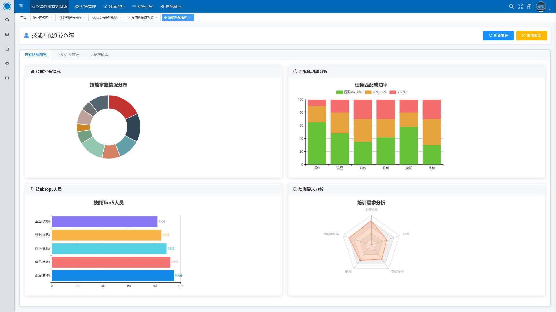 通过分析农户历史作业记录、技能水平等,系统会自动推荐高契合度的农户/农机,同时提示其技能缺口,便于安排培训或调整任务。