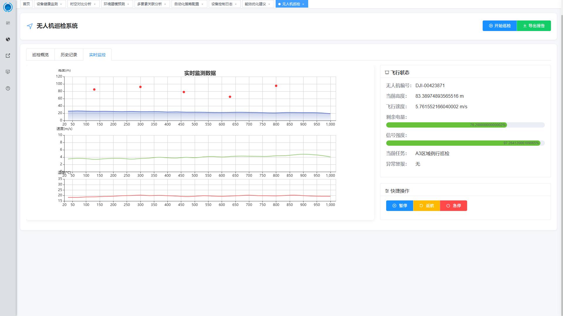 用户可通过系统规划无人机的巡检路线,无人机将自动采集多光谱、热成像等数据,并上传至平台。