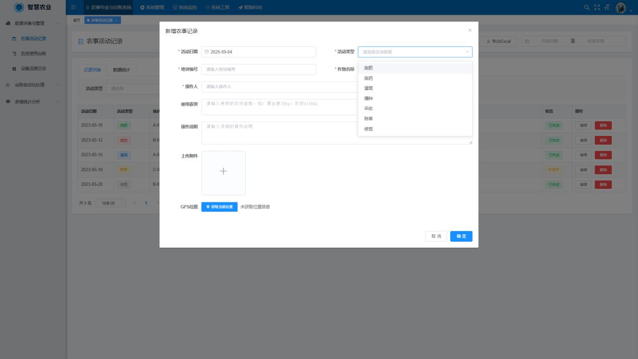 提供标准化表单模板(施肥/施药/灌溉等),支持文字、图片、视频多格式记录;可关联地块、作物、执行人等基础信息;自动生成操作时间戳和GPS定位信息。