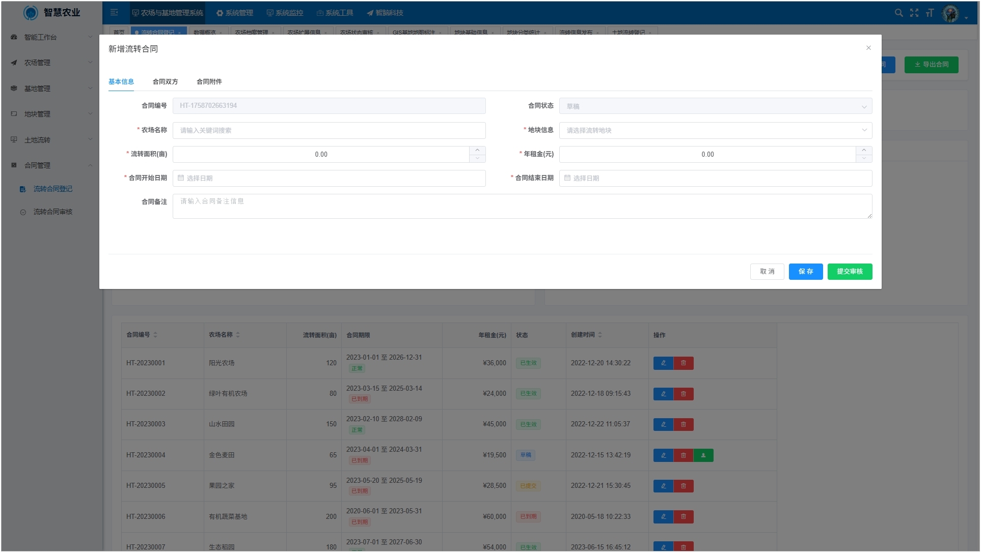 专属流转记录生成与管理,新增/绑定出租方与承租方信息,记录土地流转事件核心信息: 起止日期、 使用年限、 租金金额、 签订人双方信息、 合同编号生成较高完整性备查、 上传原附件,系统自动归档、 合同到期提醒机制自动生效(合同预追踪)。