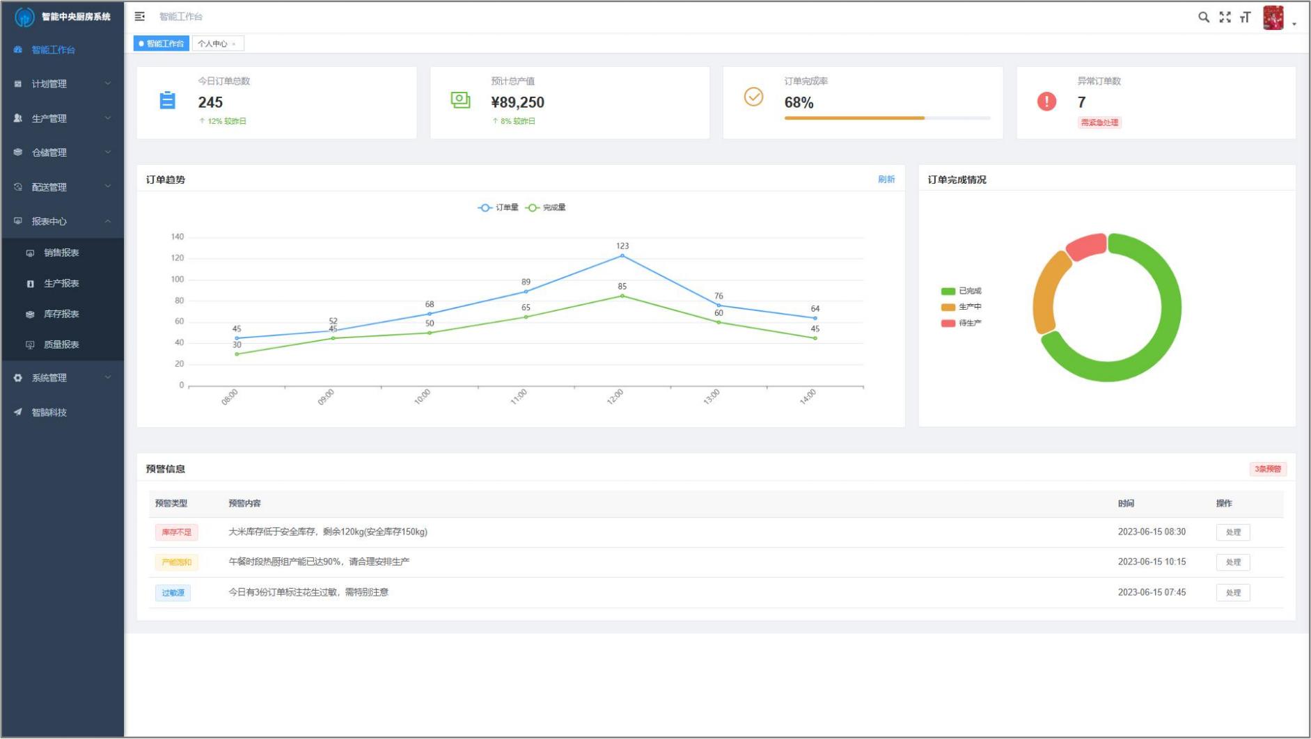 今日订单总数:显示当前未完成订单的总数,支持实时刷新。 预计总产值:根据订单金额和菜品价格计算当前计划的总收入。 订单完成率:已完成订单数量与订单总数比例显示,用于衡量当日生产情况。 异常订单数:统计带有退款、特殊要求或投诉的订单数量,可点击筛选查看具体订单。 预警信息:系统会根据库存状态和生产安排,实时显示库存不足、供货延迟、产能饱和等预警信息。