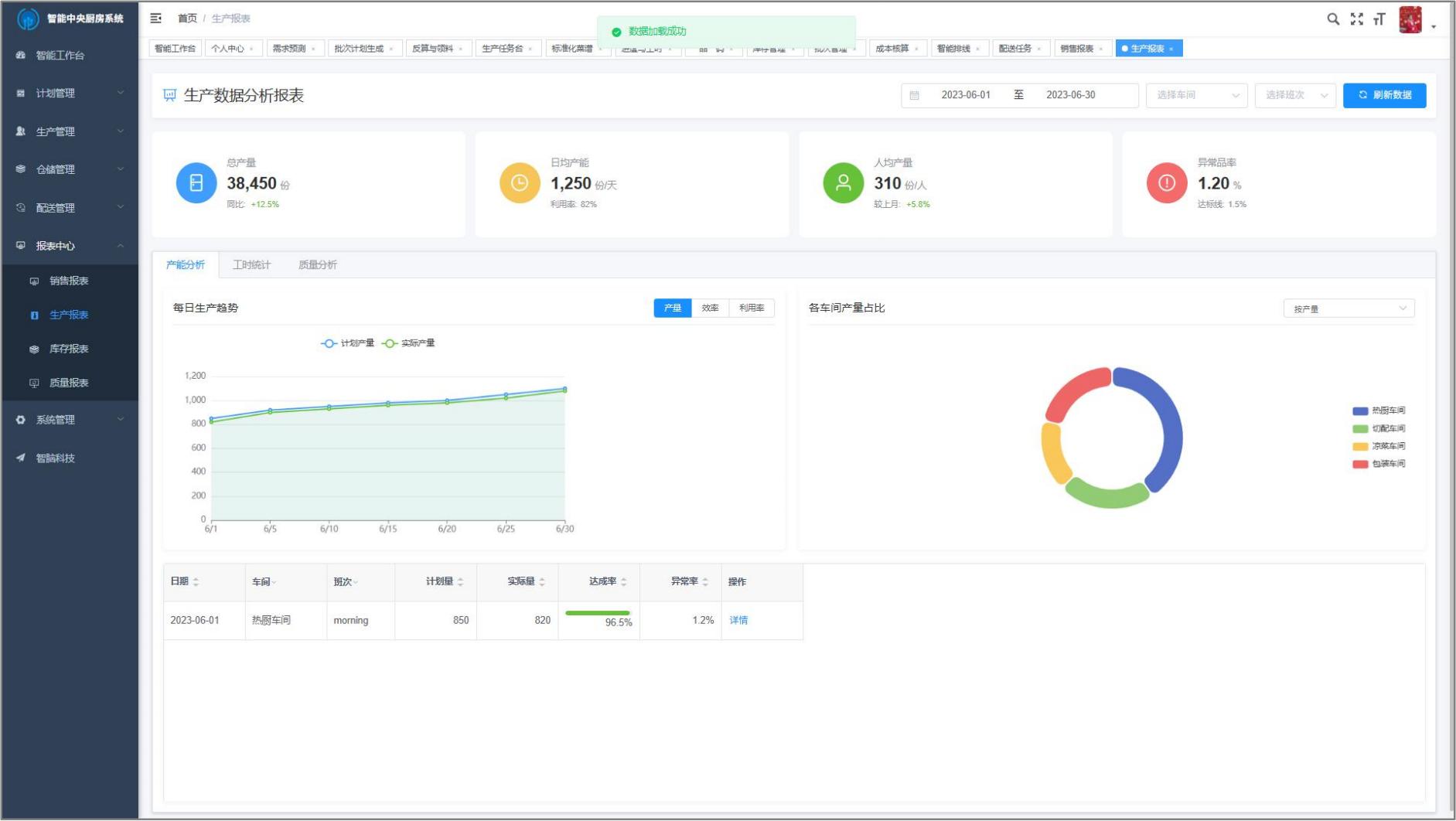 涵盖内容: 1.产能利用率(各班组实际生产与计划生产能力对比) 2.工时效率分析(各区域/品类的平均耗时) 3.耗能统计分析(每日、每日、每时段) 数据展示:支持柱状图、折线图、饼图等多维度形式呈现数据