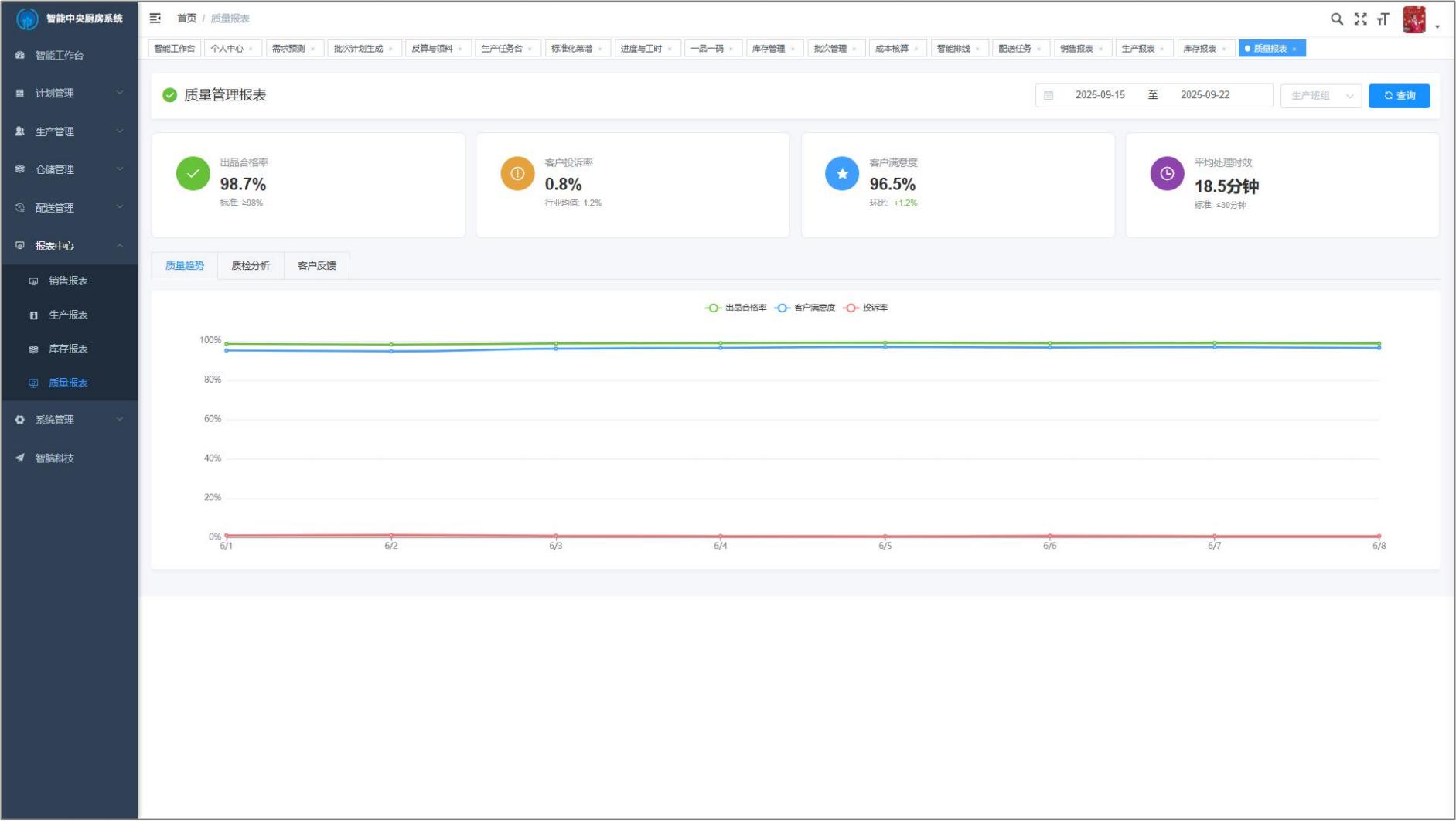 核心指标: 1.客户投诉率:统计菜品或服务不合格事件 2.出品合格率:根据扫描结果进行计算 3.溯源记录查询:支持按订单、时间、责任人等查询具体溯源信息 图表展示: 1.投诉分类统计(如:口味、温度、包装) 2.投诉与好评趋势图 3.质检数据对比分析