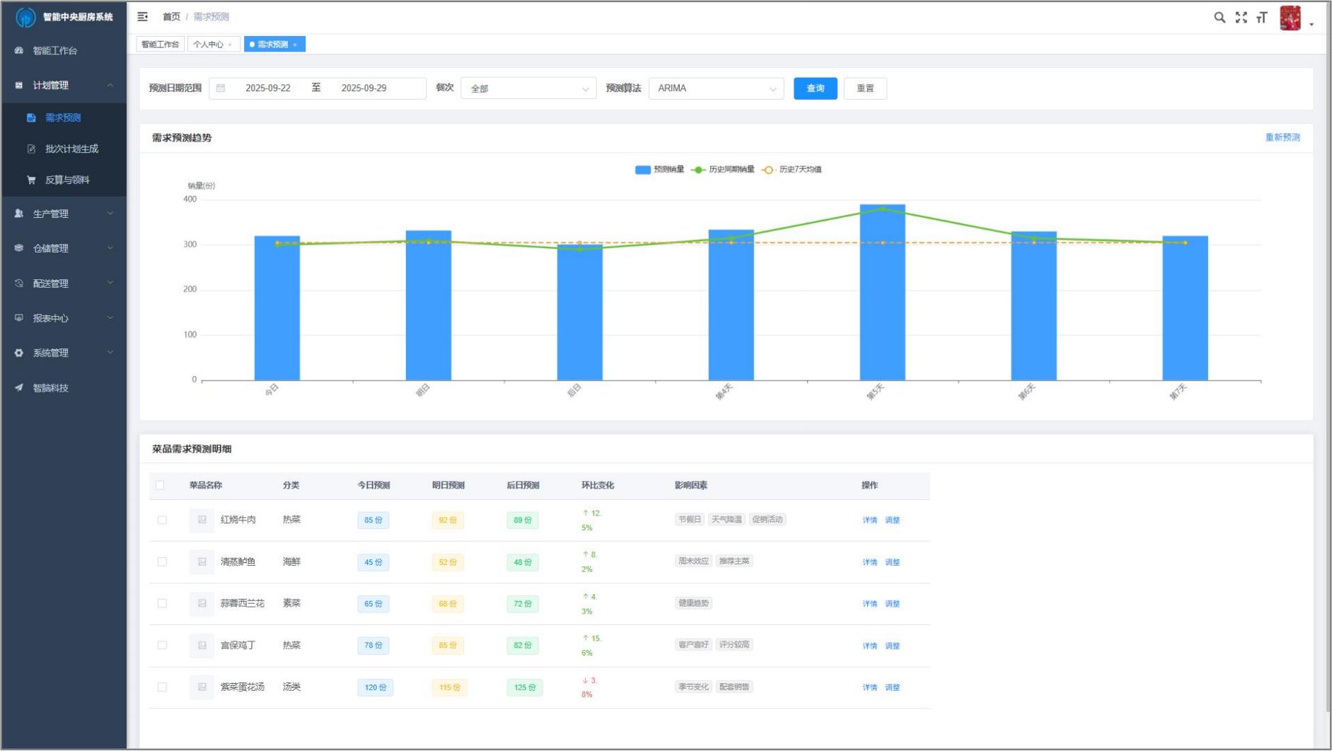 1.使用场景:用于预测未来几天的订单量,指导采购和库存准备。 2.支持因素: 历史订单数据 公共节假日 天气变化(如大暴雨天气影响外卖配送) 3.输出形式:系统自动生成预测数据,手动调整后可保存进行生产计划制定。 4.数据展示:支持以表格形式查看预测明细,包括每品种类的预测份数。