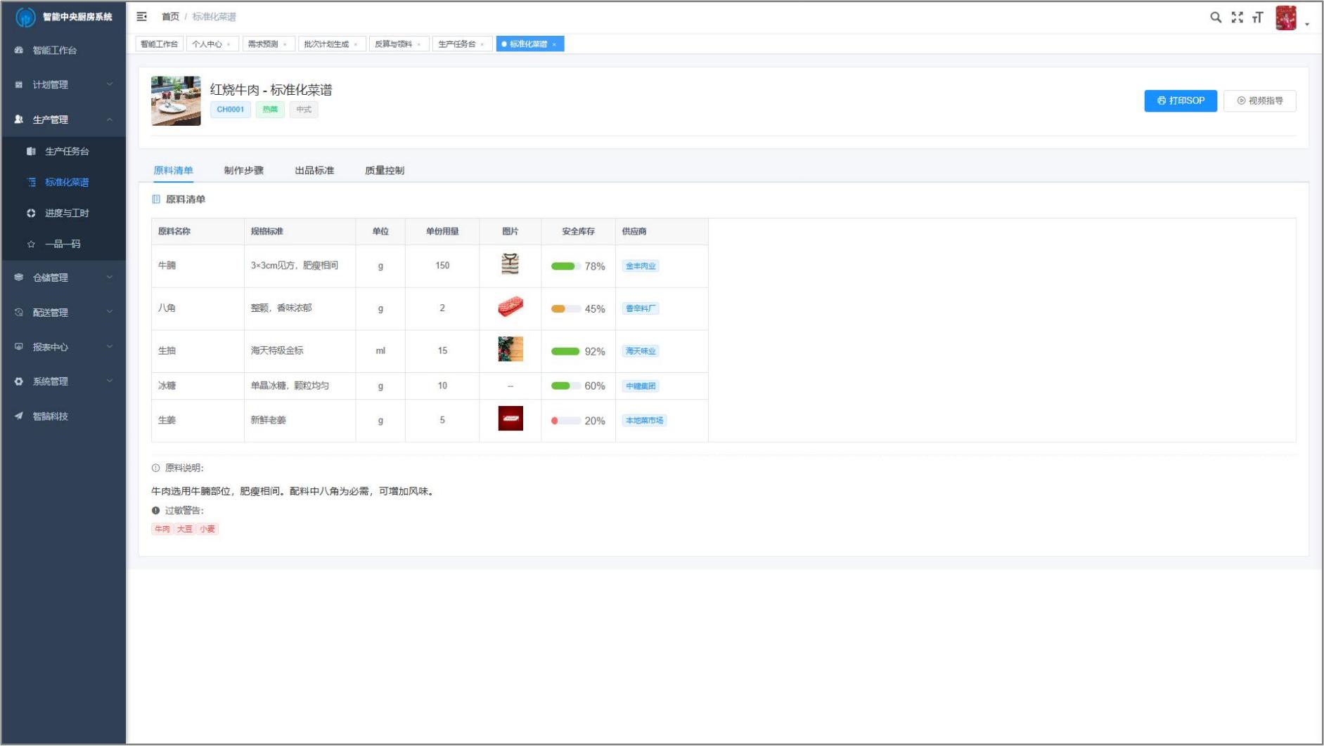 包含内容: 1.投料量(精确至克) 2.烹饪流程图 3.火候要求 4.成品标准图 5.份餐克重要求 操作指引: 1.点击菜品名称查看 SOP 详情 2.遇到流程不明确时可反馈问题,系统记录并推送至相关人员o 系统支持图文与视频混合展示,方便教学与操作